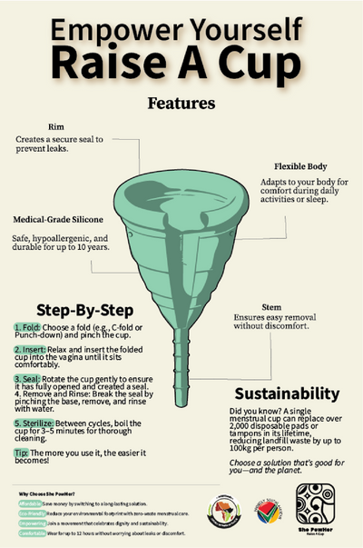 The redesign established a cohesive, confident visual language centred on empowerment and accessibility. A refined colour palette of mint green, ivory, and black conveyed health, freshness, and strength, while new brand assets — including posters, educational materials, a modernised website, social templates, and a modular event booth — created a unified ecosystem. Messaging centred around the campaign concept “Raise a Cup”, connecting empowerment and sustainability through both visual and verbal storytelling. Educational resources such as worksheets, community posters, and outreach materials helped bridge cultural and informational gaps, supporting ShePowHer’s social mission.