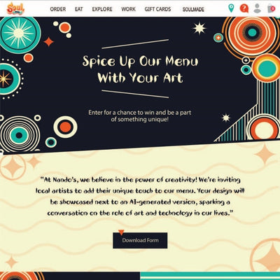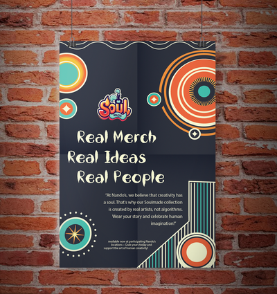 The integrated campaign unfolded across four key touchpoints: a microsite introducing the initiative and hosting a design competition, a set of in-store menus contrasting AI-generated and human-created designs, limited-edition print materials such as sketchbooks, posters, and T-shirts, and finally, a hand-illustrated mural celebrating collaboration, creativity, and community. Together, these elements reinforced Nando’s reputation as a brand that stands for originality, human expression, and cultural connection in the age of AI.